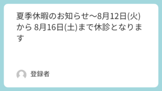 お知らせ 夏季休暇のお知らせ〜8月12日(火)から 8月16日(土)まで休診となります 夏季休暇のお知らせ8月12日(火)から 8月16日(土)まで休診となります※日曜(8/10.17) 国民の祝日(8/11)は通常通り休診となります。ご不便をおかけしますがよろしくお願いします。 2025.07.23 お知らせ